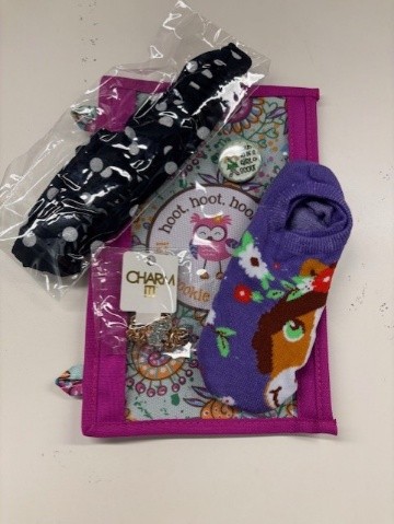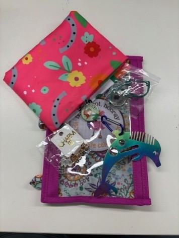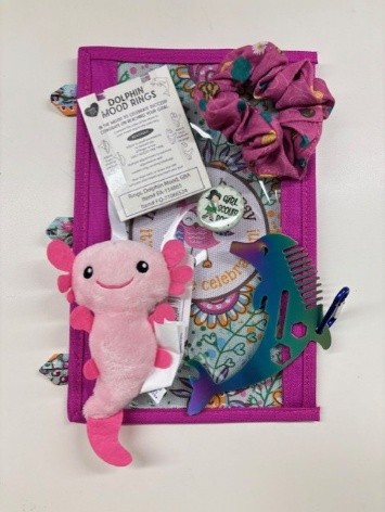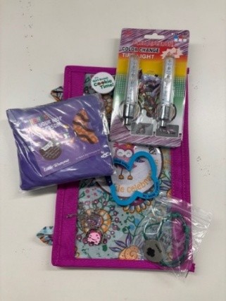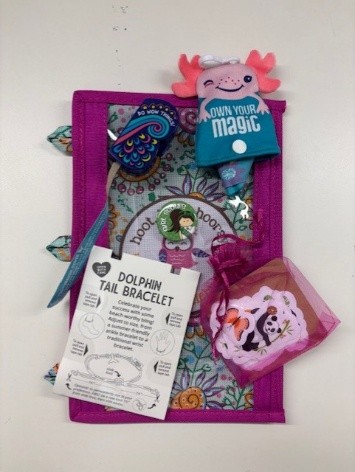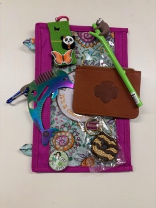 Binder Pouch, GSEM bracelet, Bike tire lights, Axolotl necklace, Button, Mini tote, Butterfly carabiner